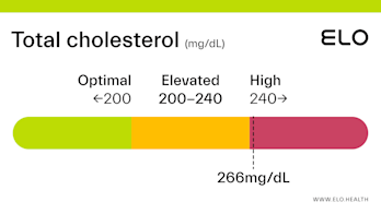 A total cholesterol level of 266 mg/dL is considered high. Although cholesterol has several essential functions in the body, high cholesterol puts you at greater risk for heart disease.
